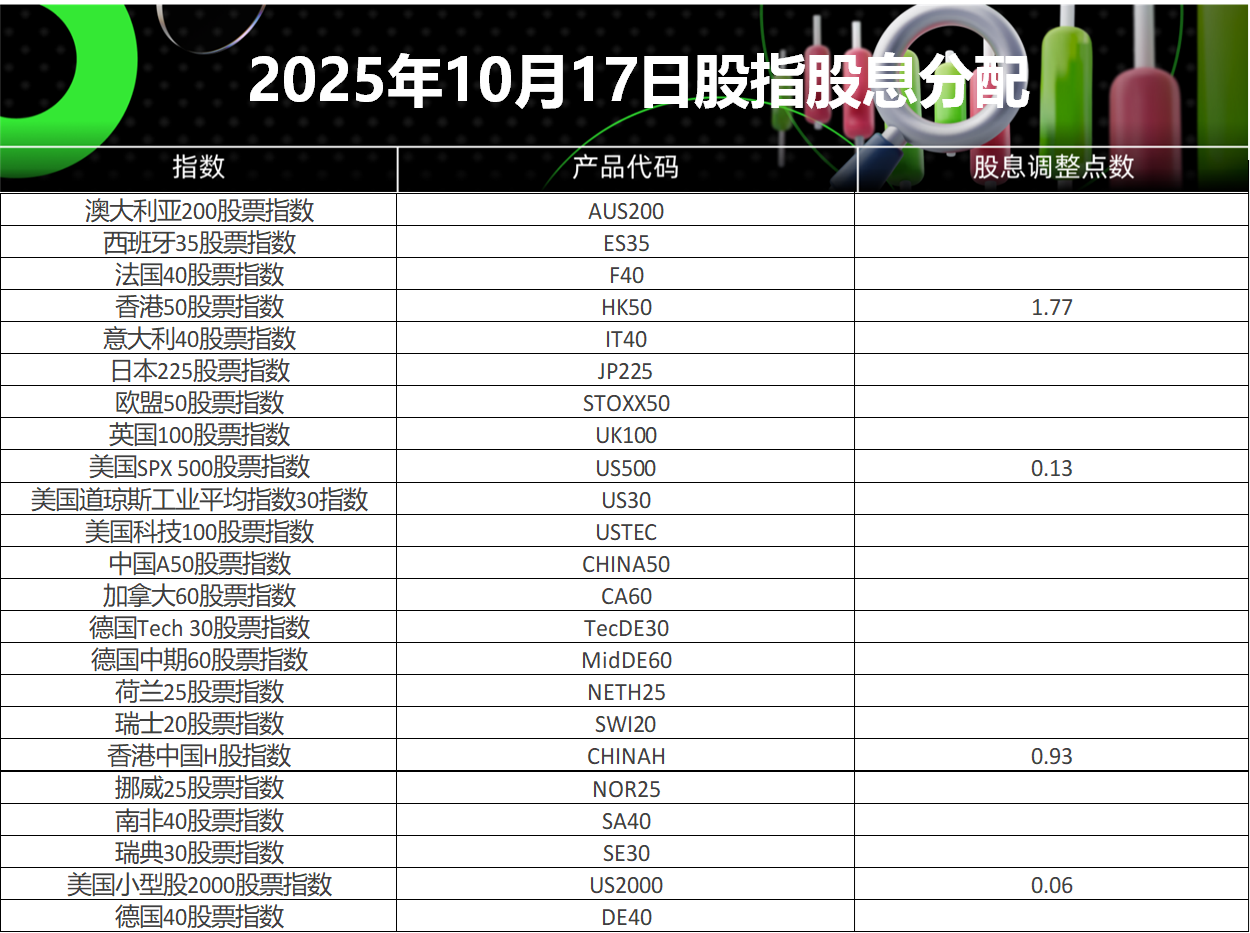 17 Oct 2025 2025年10月股指股息分配表 (2025-10-17) Rachel Yu No Comments 亲爱的客户您好, 请查阅我们更新的2025年10月17日股指股息分配表。 以下所有时间均为平台时间(GMT+3) IC Markets Global 中文团队 中文官网: https://ic-asia-official.com Email: support.cn@icmarkets-cs.com 微博:@IC小帮手