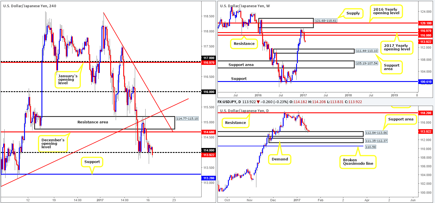 Our suggestions: Selling beyond 114 is out of the question for our team, despite weekly structure supporting such a setup. If you still believe a sell beyond 114 is viable, we would strongly advise waiting for price to not only retest the underside of 114 as resistance, but also to wait for a lower timeframe confirming sell setup (see the top of this report) following the retest. This will not guarantee a winning trade, but it will certainly add weight to the setup.