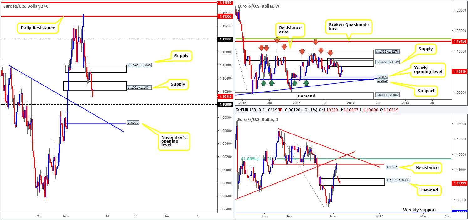 The EUR closed marginally lower on Tuesday, resulting in the unit piercing through the lower edge of a nearby H4 demand zone coming in at 1.1021-1.1034 (now acting supply). As of this point, it appears the market is pricing in a Clinton win, which by many, is seen as the status quo candidate.
